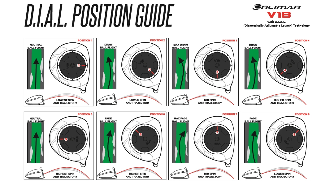 The key feature of the Orlimar V18 driver is an 8-position rotatable sole which weighs an enormous 35 grams including an offset tungsten weight. The offset tungsten weight on the sole shifts the center of gravity when rotated which alters the ball flight or what we call D.I.A.L. (Diametrically Adjustable Launch) Technology. You can increase the MOI and launch angle by rotating the red line on the dial sole to the rear, reducing spin by moving that red line to the face or create fades or draws by placing it in the toe or heel positions.  In seconds, one can fine-tune the V18 dial sole to suit the player’s needs.